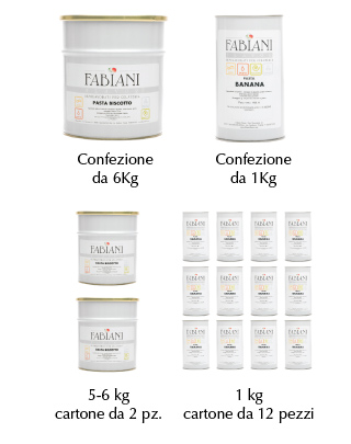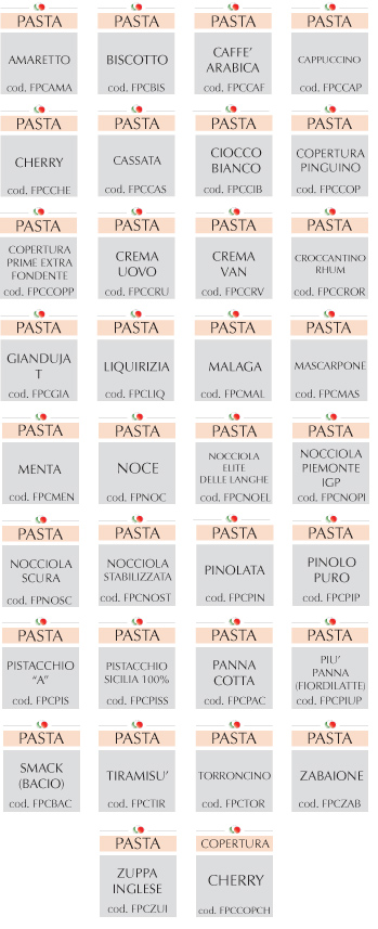 Vasta gamma di paste ottenute da materie prime di qualitą superiore abilmente miscelate, di grande corpositą, con fragranze particolari: 4 tipi di pasta nocciola - 2 di pistacchio. La qualitą dipende dalla scelta delle materie prime alla fonte: Nocciole Piemonte - Pistacchio Bronte - Pinolo puro Toscano - Estratto di zuppa inglese - Caffč Arabica - Menta trirettificata - Cioccolato da cacao olandese, ecc.